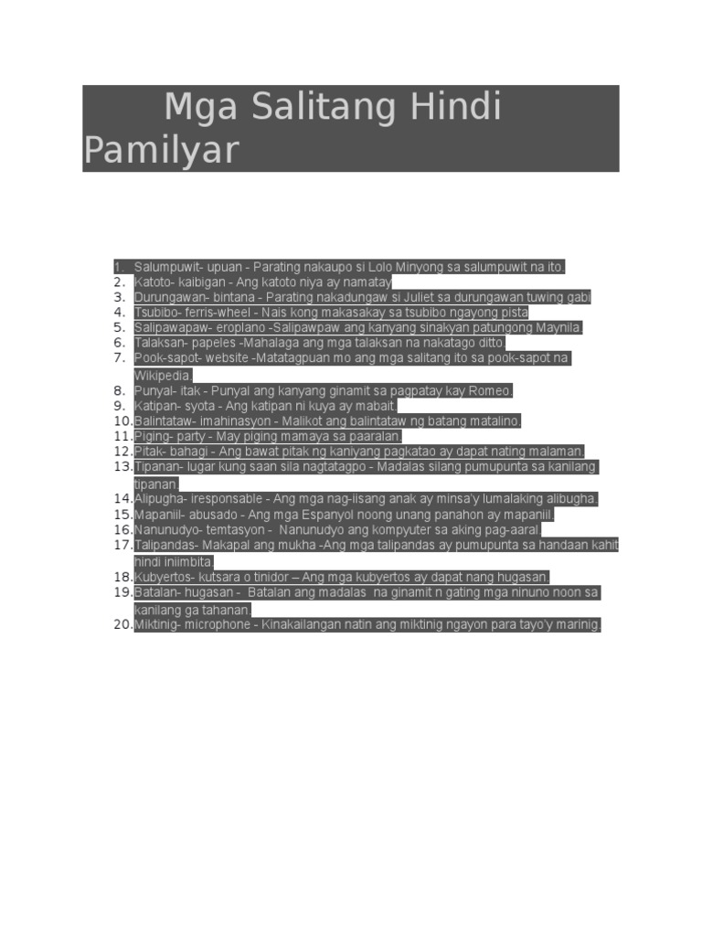 Mga Hindi Pamilyar na Tagalog na Salita. 10 hindi pamilyar na salita. Isa ito sa mga dahilan kung bakit hindi na nagagamit ang mga malalalim na salita dahil sa mas.