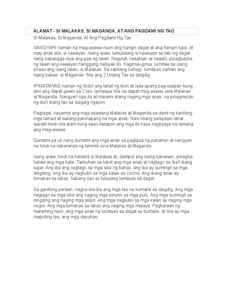 Si malakas at si maganda ang pinagmulan ng mga tao. Why is the Sea Salty Si Malakas Si Maganda at Ang Pagdami ng Tao. Kakalasan-nang lumabas sa punong kawayan si Malakas at si Maganda. Isang araw lumulutang si kawayan sa tabi ng dagat nang nabangga niya ang paa ng lawin.