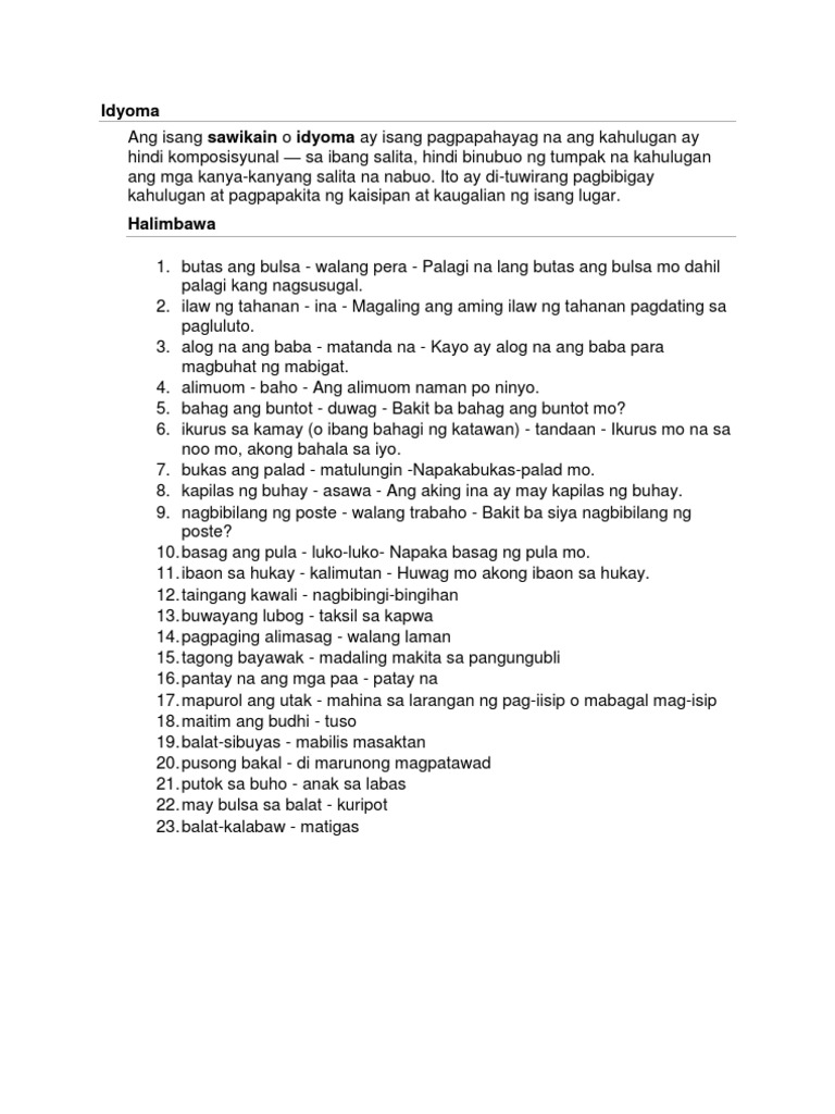 Ano Ang Idyoma At Mga Halimbawa Pdf